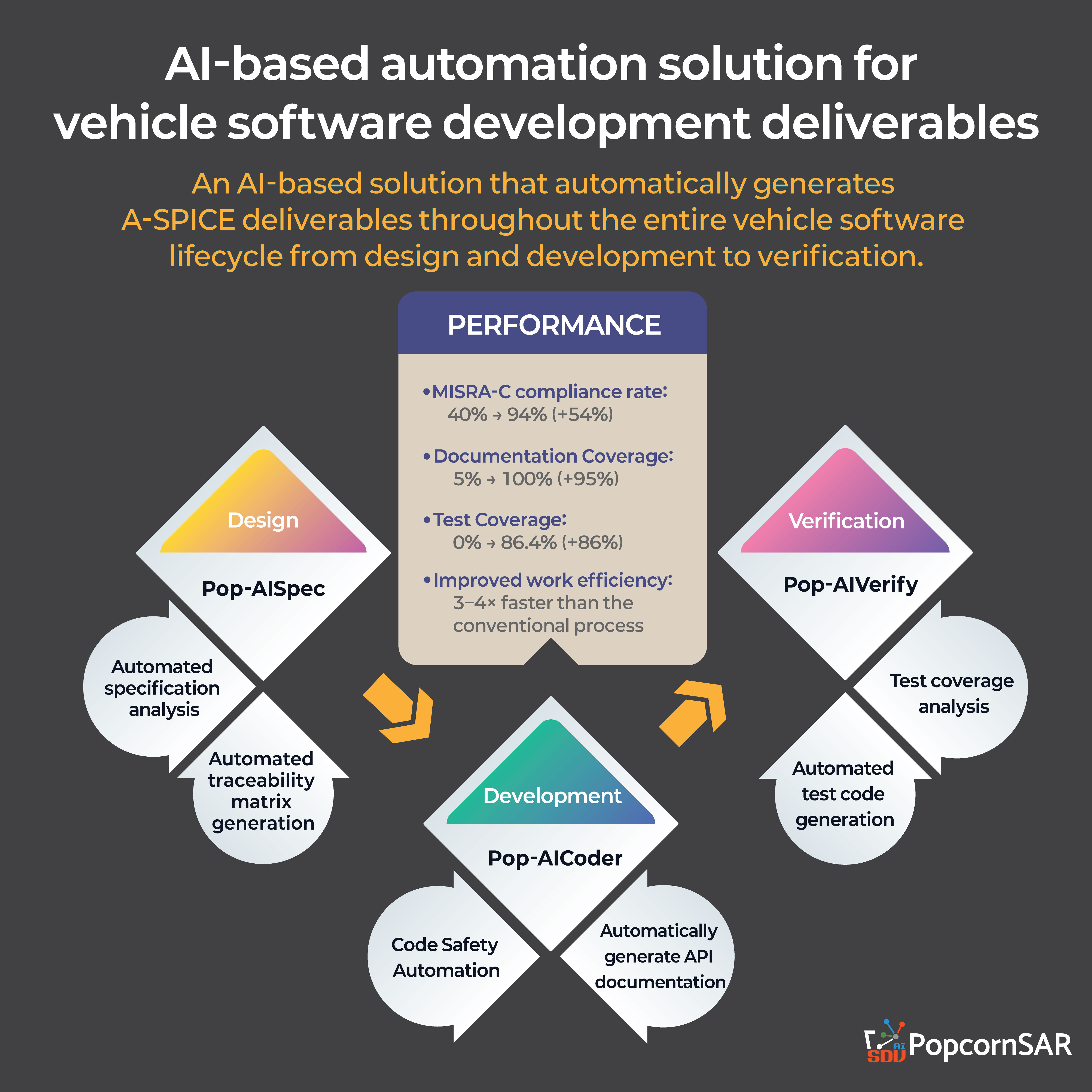 PopcornSARは、このような非効率を改善するためにAIベースの車載ソフトウェア開発成果物自動化製品を開発しました。設計、開発、検証の全工程を単一のデータフローでつなぎ、繰り返しの作業を最小化するとともに、A-SPICEプロセスに準拠したドキュメント・コード・テスト成果物を自動生成することで、品質と生産性を同時に向上できます。