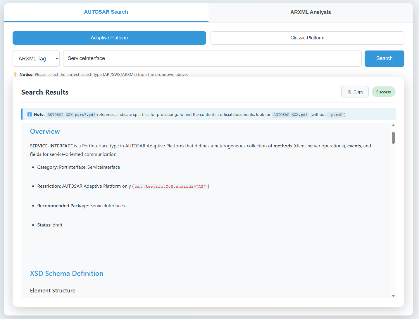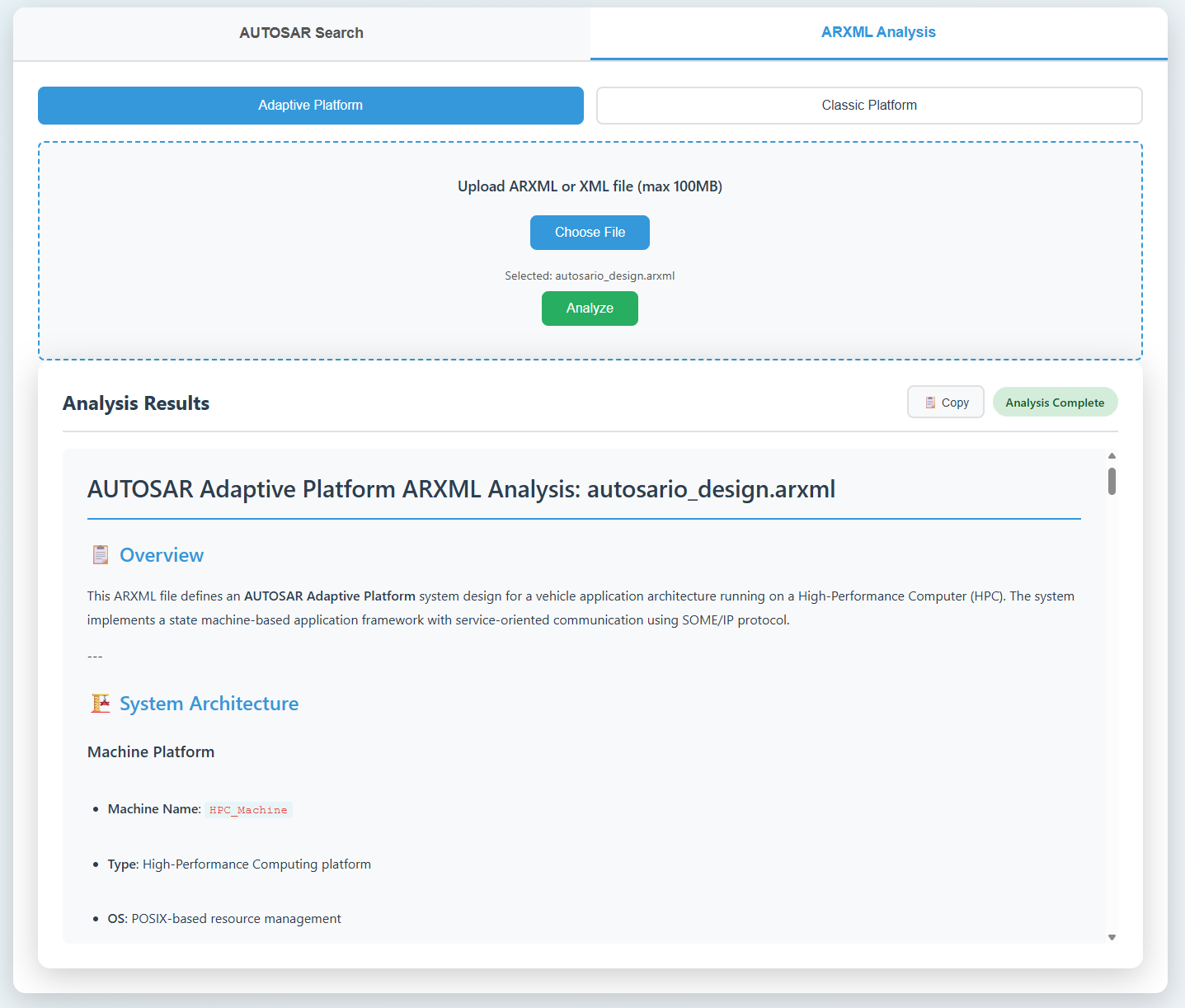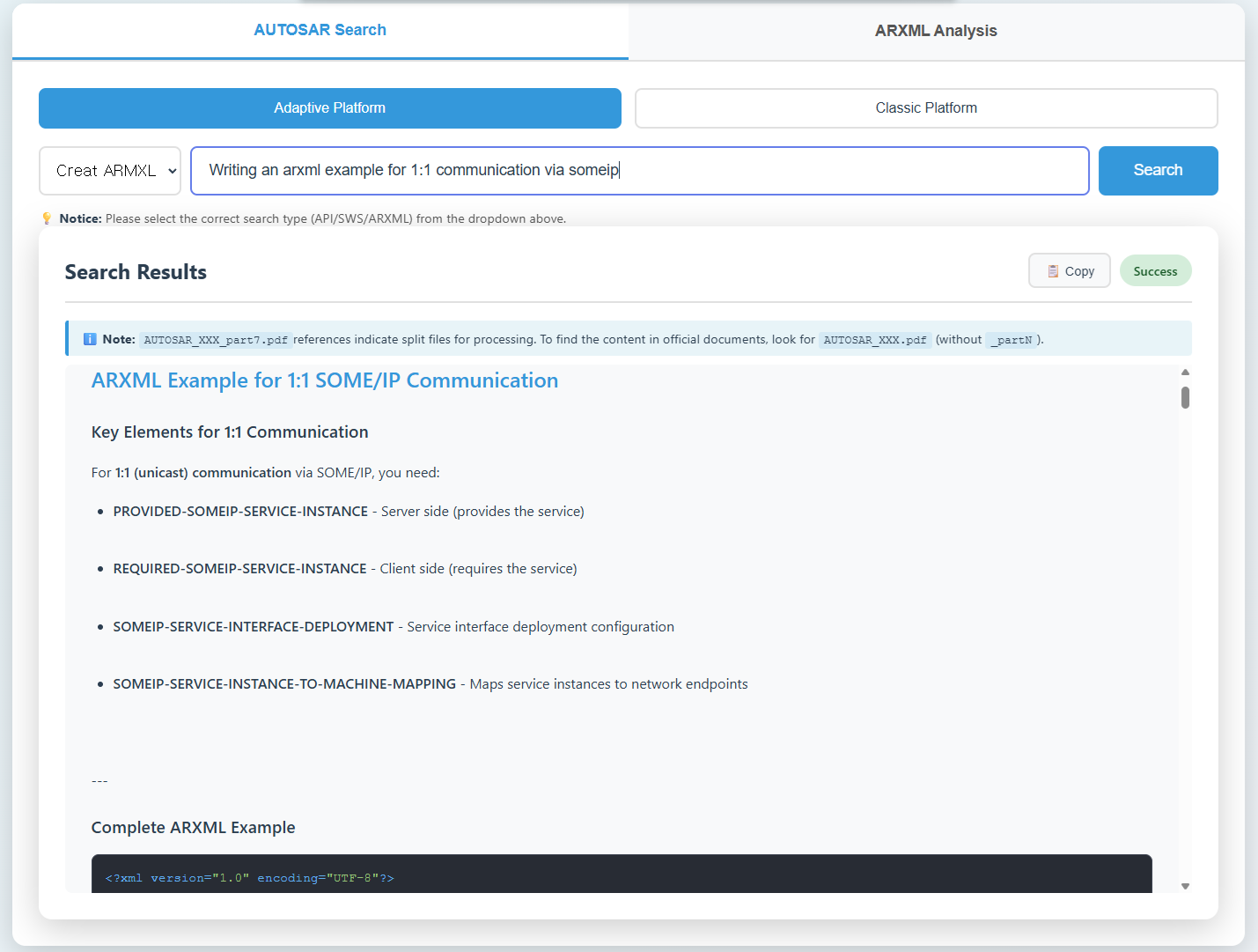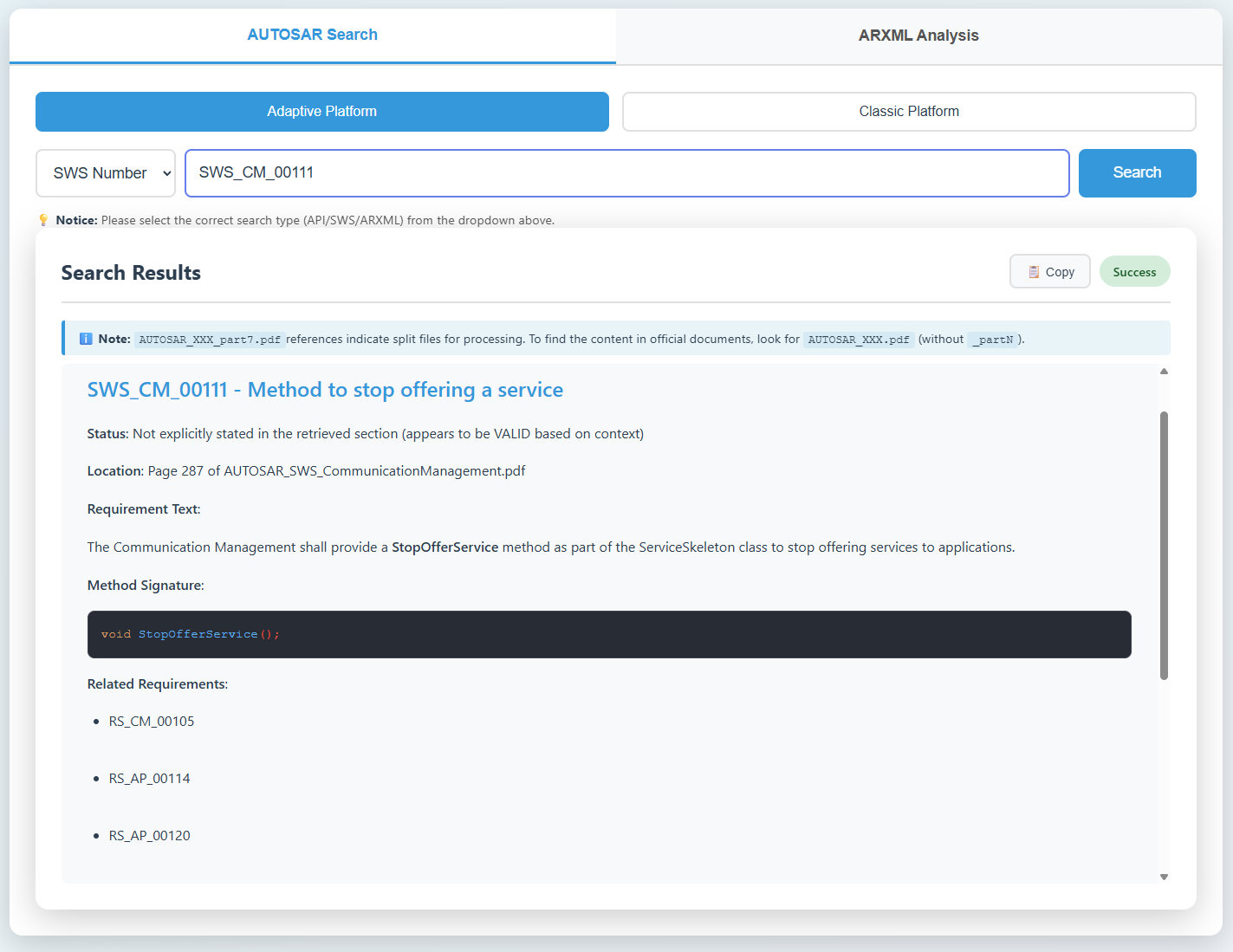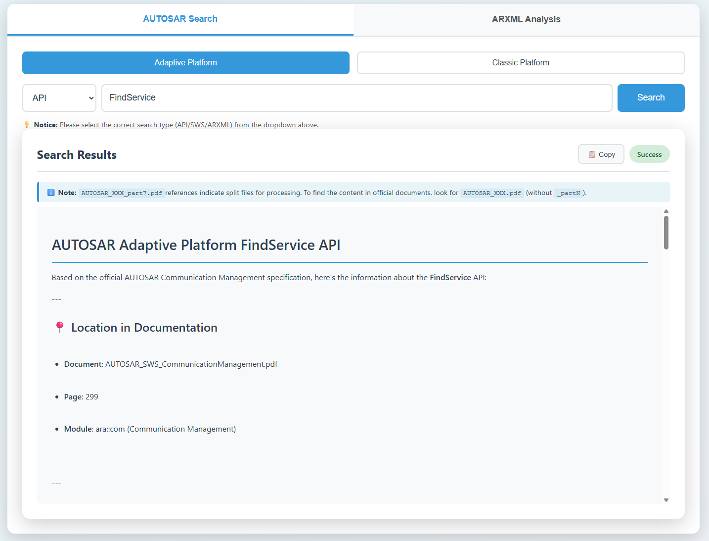 - AUTOSAR API를 자연어로 검색하고 사용법을 제공받습니다. 방대한 PDF 문서에서 API를 찾는 번거로움 없이 즉시 필요한 정보에 접근할 수 있습니다.